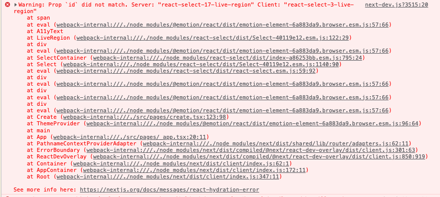 1. 새로고침할때마다 에러 메시지에있는 Server: "react-select-4-live-region"에서 숫자가 1씩 증가한다..! ("react-select-4-live-region"는 react-select 엘리먼트의 id임)