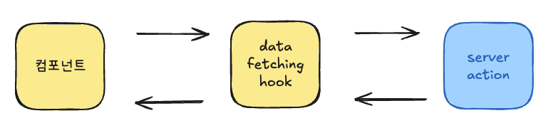 컴포넌트에서 data fetching 훅을 호출하고, data fetching hook에서 server action을 호출한다.